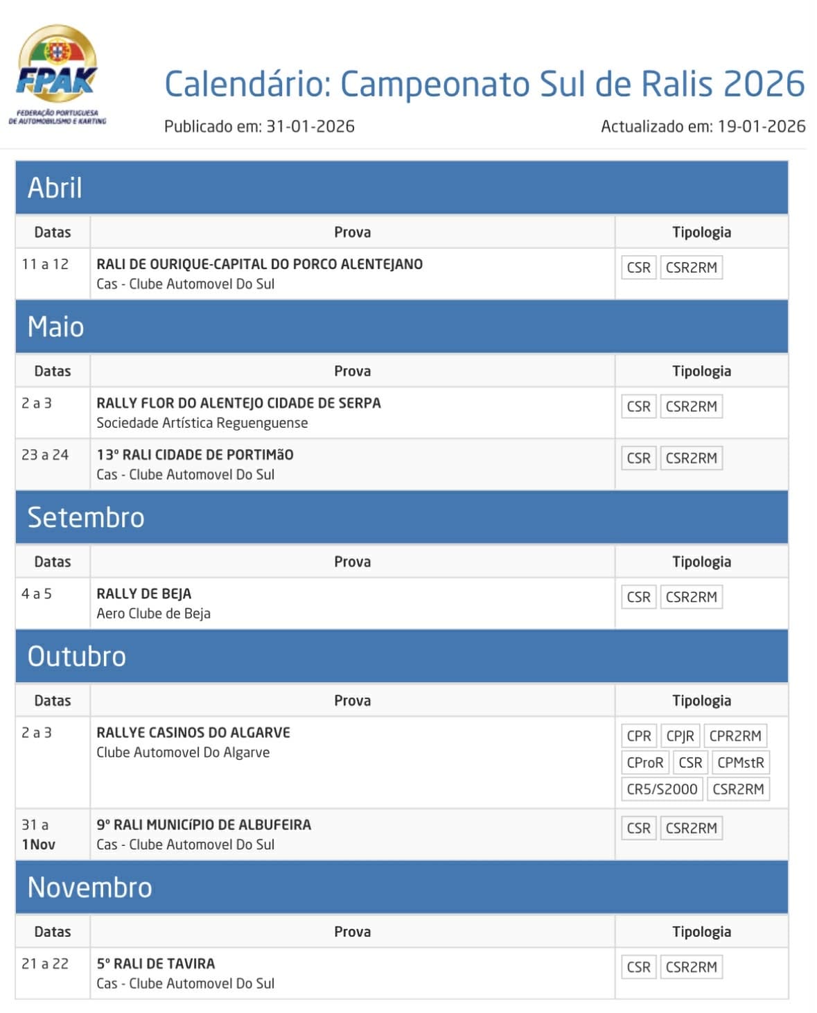 29-11-2025 e 30-11-2025 Entre os dias 29 e 30 de Novembro de 2025 disputou-se por terras de Tavira mais uma edição do RALI DE TAVIRA – ENCIVIL – ENCIVIL – 2025. Pontuável para o Campeonato Start Sul de Ralis, Campeonato Start 2RM Sul de Ralis 2025. Organizado pelo Cas – Clube Automovel Do Sul Site […]